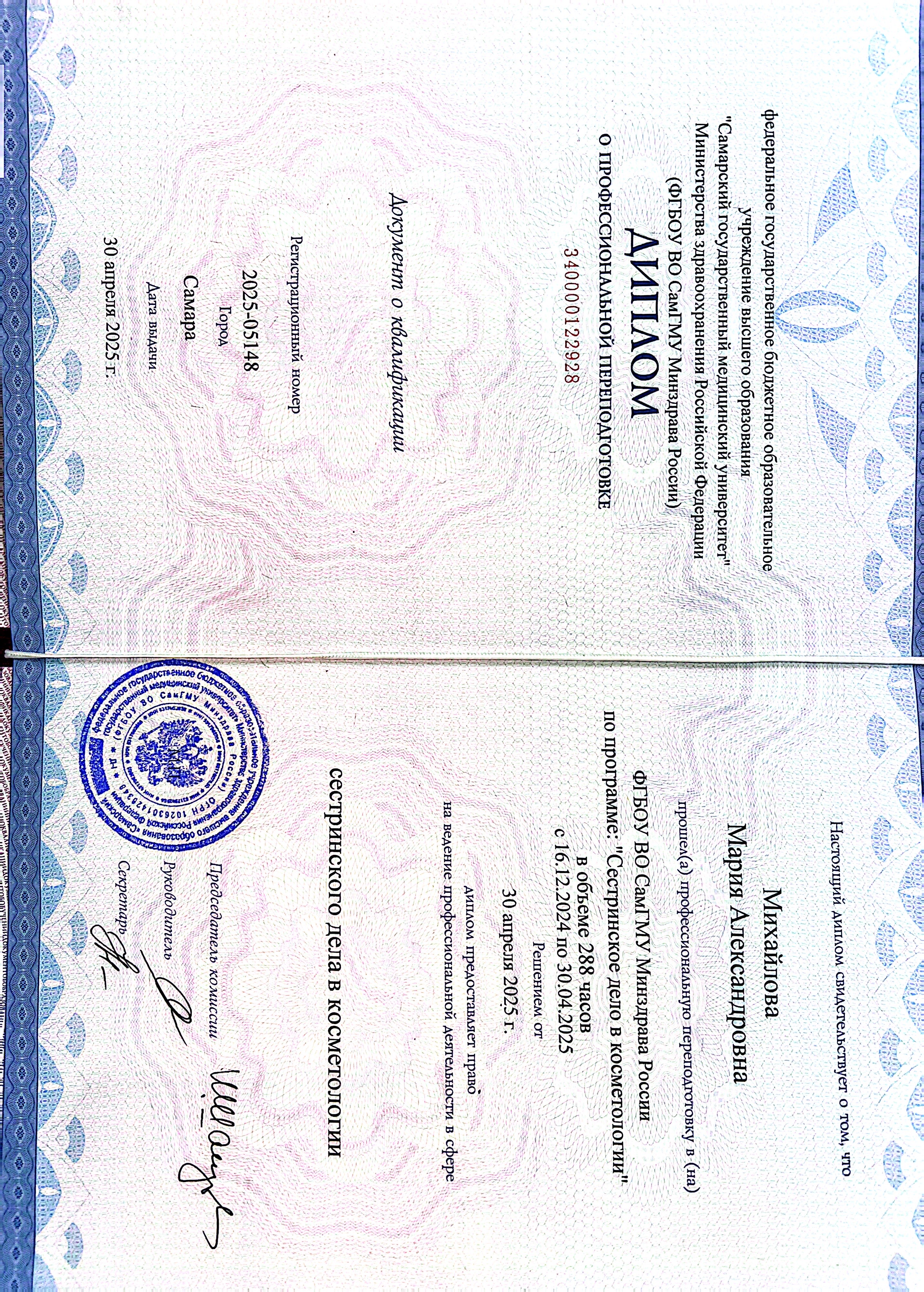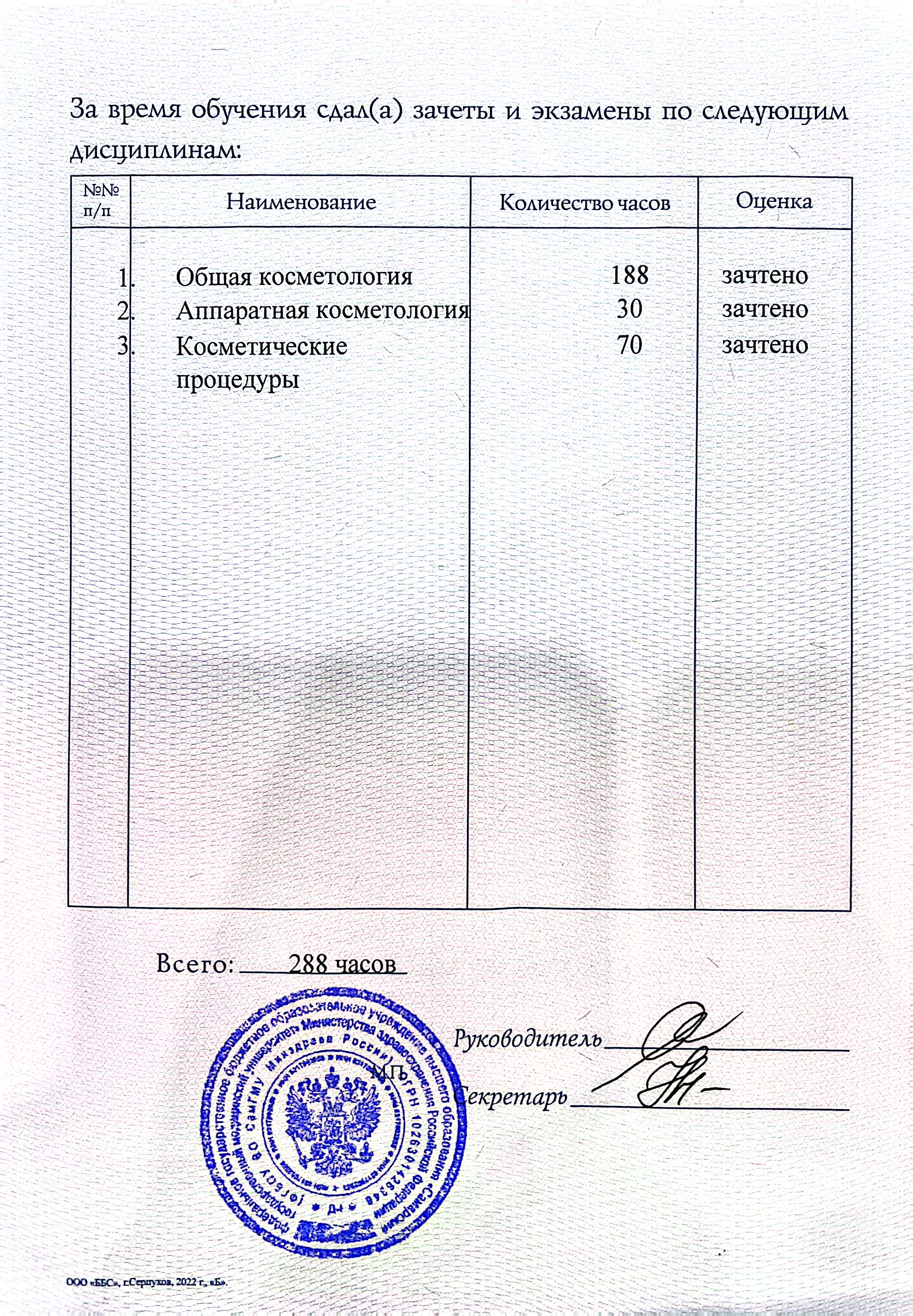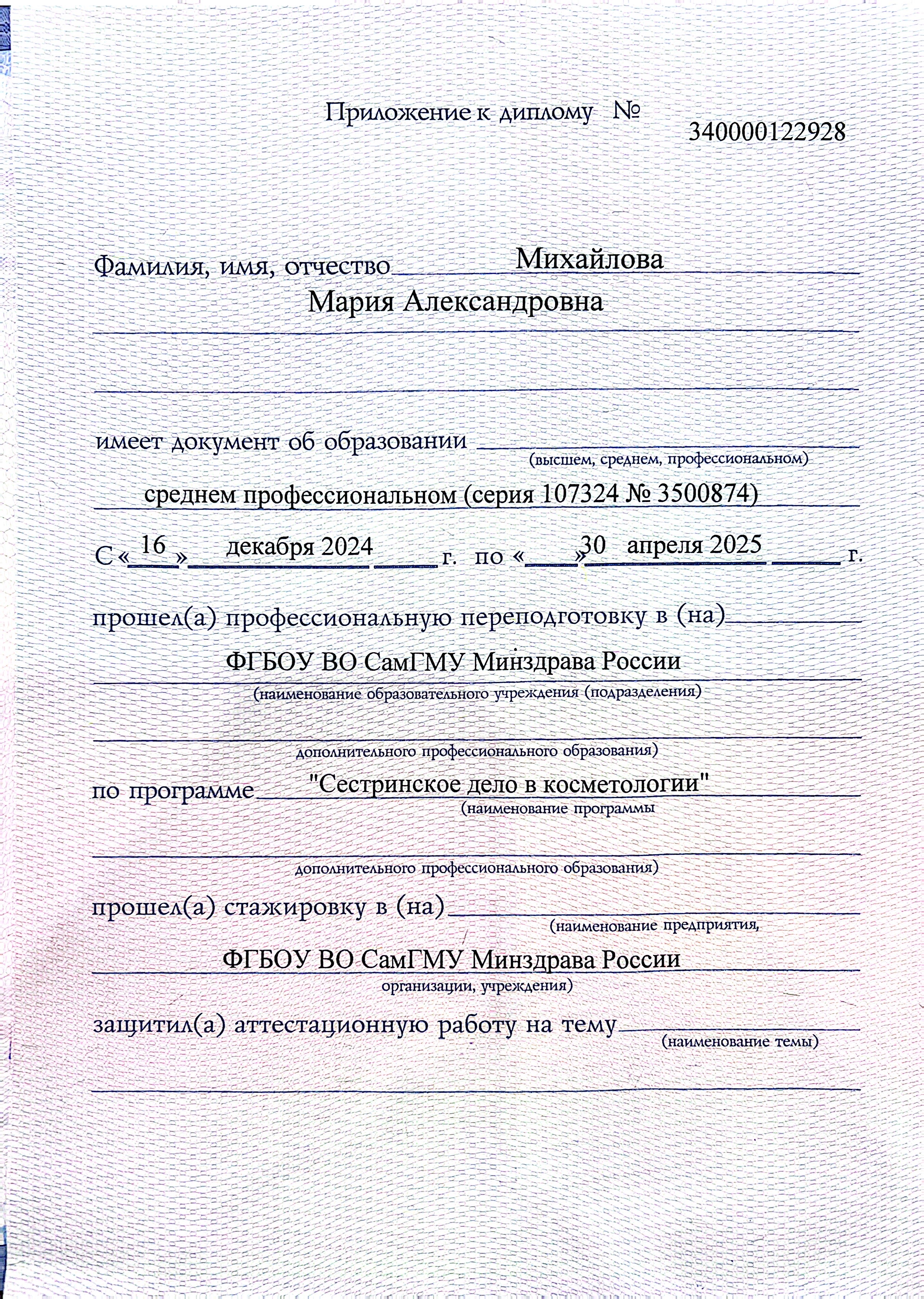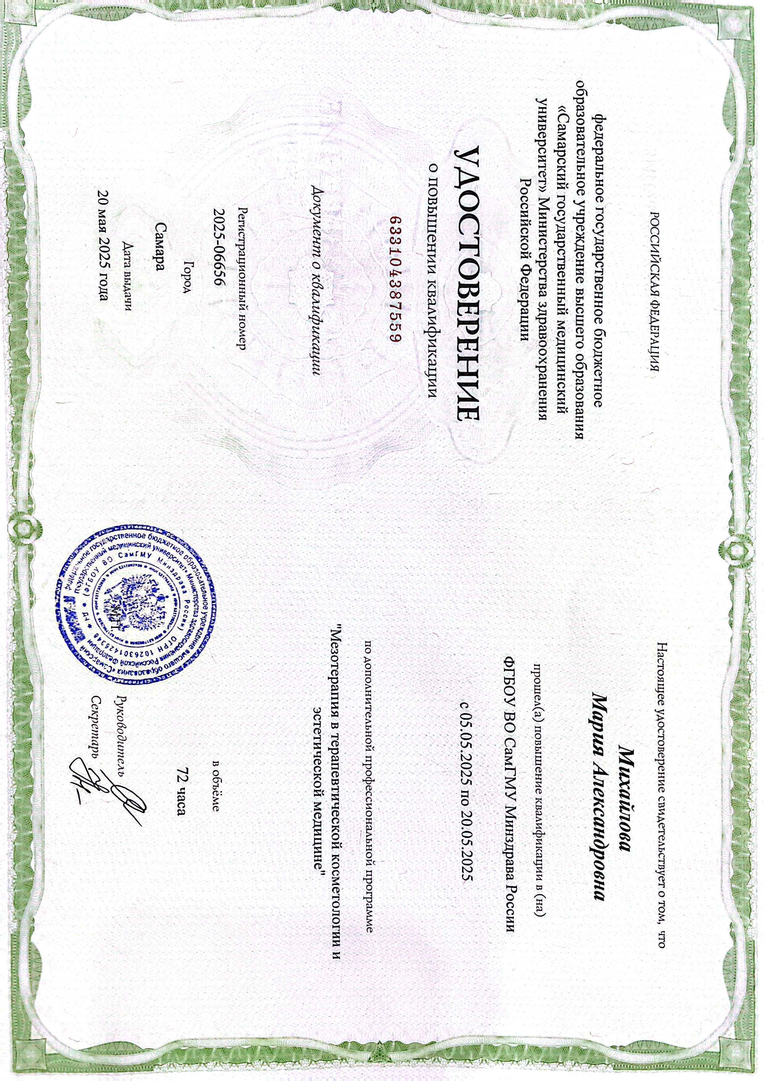 В 2025 закончила ФГБОУ ВО СамГМУ Минздрава России по программе «Сестринское дело в косметологии, так же получила удостоверение по программе «Мезотерапия в терапевтической косметологии и эстетической медицине».